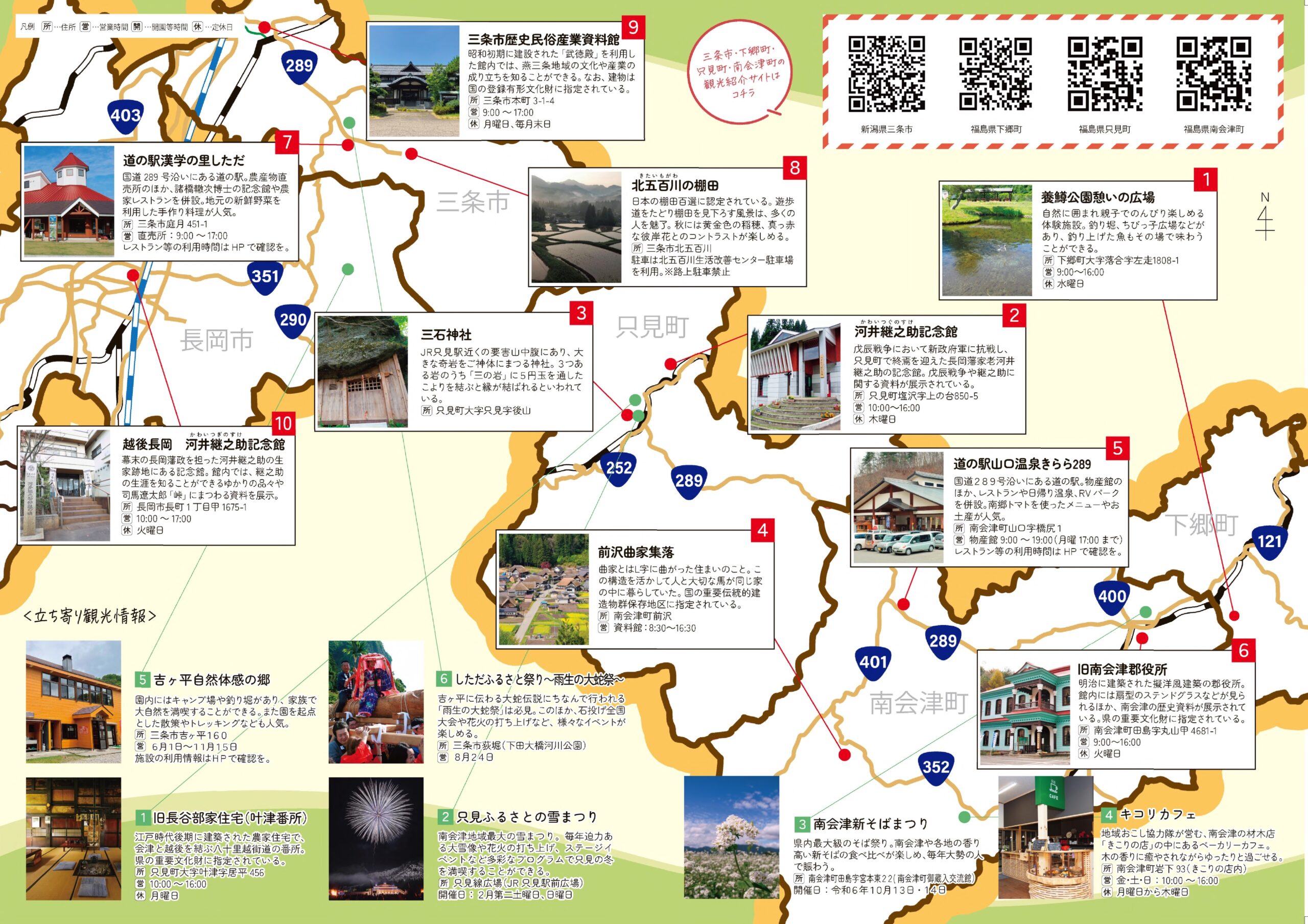 養鱒公園憩いの広場、河井継之助記念館、三石神社、前沢曲家集落、道の駅山口温泉きらら289、旧南会津郡役所