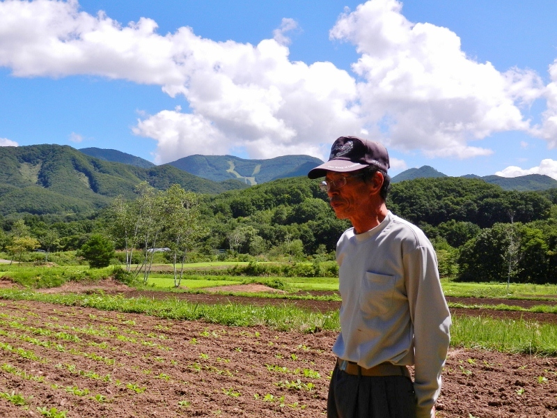 芳賀さんに作業の様子を見せていただきます。コロコロコロコロ・・・・ひたすらマシンを押して畑の向こう岸へ。行きついたら、4~50cmの間隔をあけて、向こう岸からこちらへ再びコロコロコロコロ。手でやるよりは確実に楽で便利ですが、なかなかの「気の遠くなる作業」であることは間違いないようです。「もっと簡単に出来る便利な機械もあっけど(あるけど)、高ぇんだもの、買えねぇからウチではこれ使ってんだ。」湯田さんが高ぇたけぇと連呼するので、おそらく便利な機械は相当な高級品であると思われます。(笑) しかし、市場に出荷せず道の駅や地域の飲食店に納品するような規模の栽培では、合理性、経済性を考えて最も費用対効果の大きい方法を考えることも、栽培において必要な過程ですもんね。