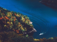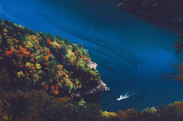 日本第3位の総貯水量を誇るダム湖。青い湖面と赤や黄色の山々のコントラストが見事 |