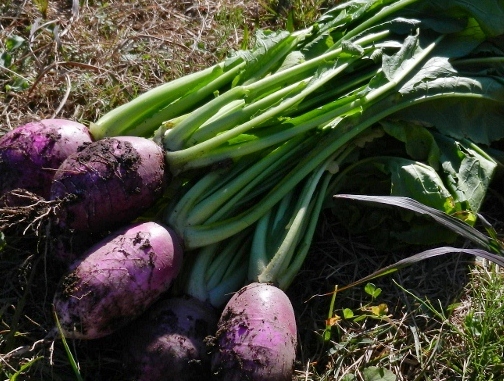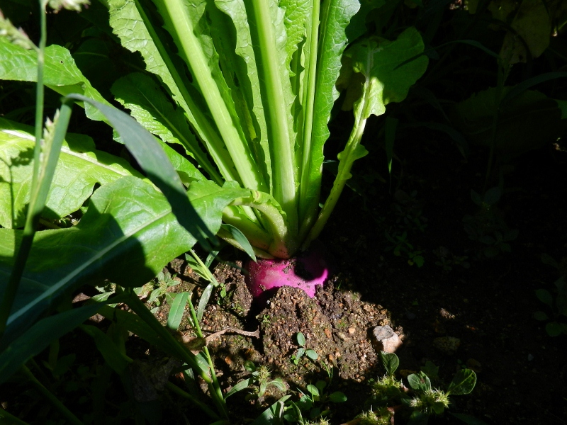 見事に顔を出しました!今年の出来栄えは「良好」です。 赤カブの「赤」はポリフェノールの色素の色です。 また、カブの部分ではビタミンCや整腸作用のあるアミラーゼを豊富に含みます。春の七草にも数えられていて、お正月で疲れた胃腸も癒してくれます。葉や茎の部分では、カロチンや鉄・カルシウムなども含んで、抗がん作用も期待できるようです。 根と茎の部分で含まれる栄養素に違いがあります。どの部分も余すとこなく食べる事によって豊富な栄養素を摂取できて一石二鳥ですね。