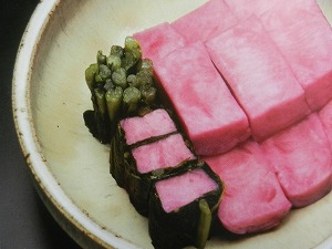 甘酸っぱくて、ついつい箸が進んでしまう「赤カブ漬け」お酢を加えると赤色が広がってピンクになる 彩りもきれいで秋の食卓を飾ってくれますね。道の駅ばんやで販売しています。 詳細は、ご確認ください。 また湯の花温泉の旅館・民宿で振る舞われます。紅葉や渓流釣りと共に、秋の味覚もお楽しみくださいね。