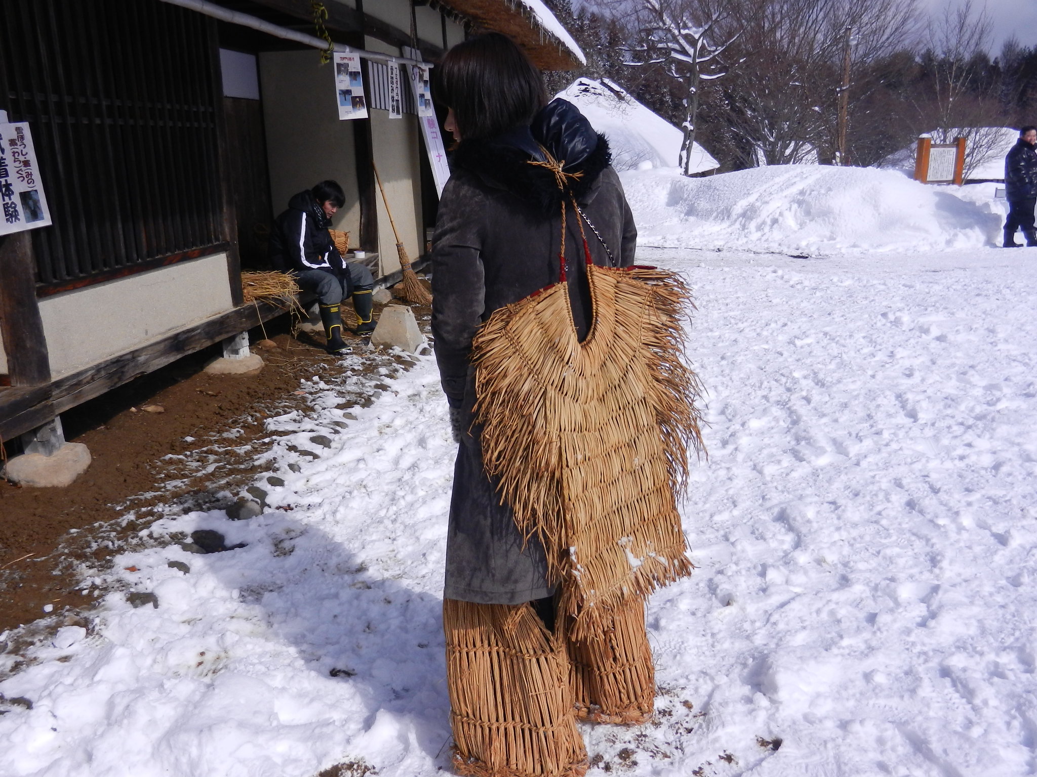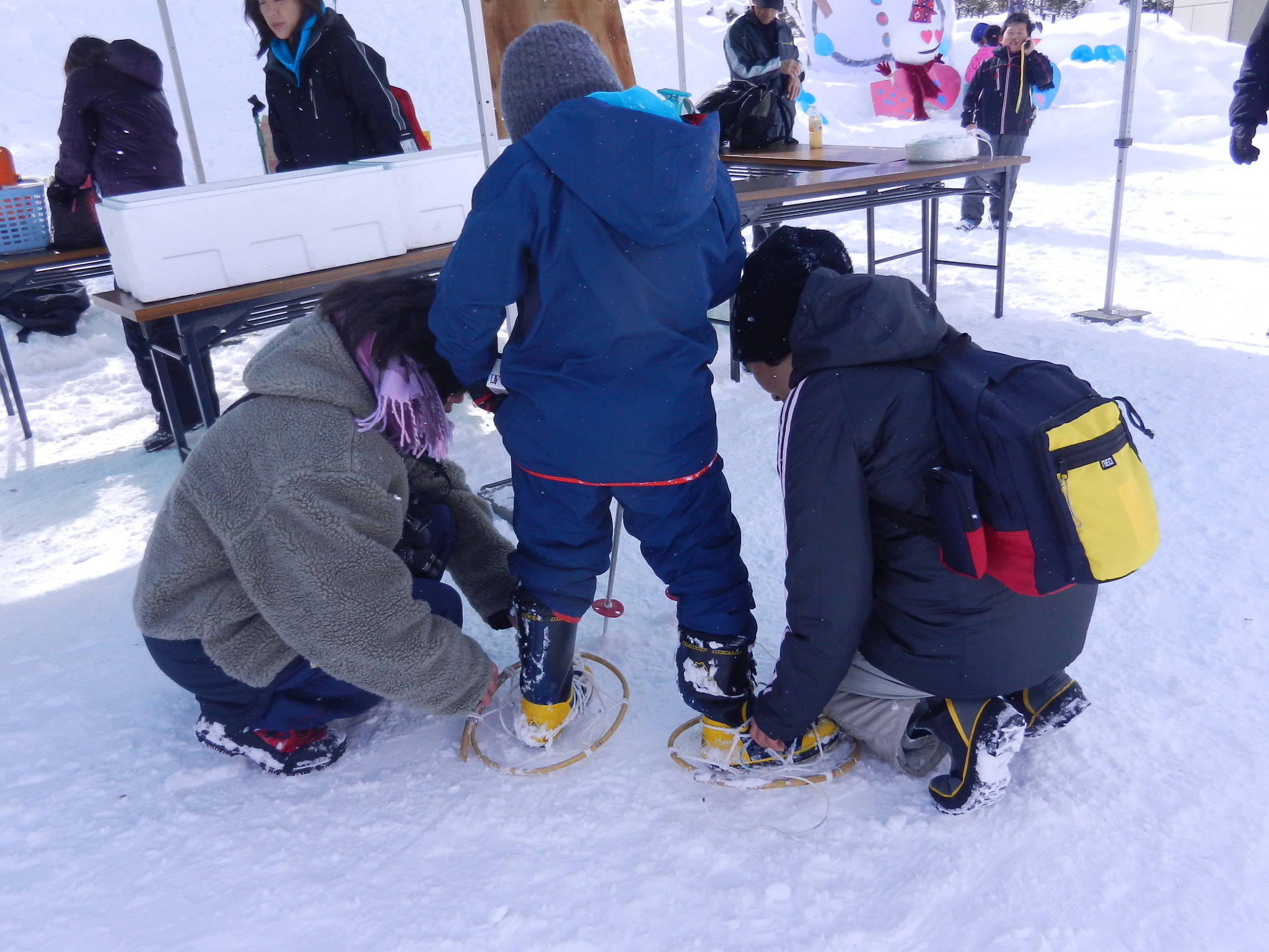 会場には、雪で作ったソリの滑り台や、ミノやワラ靴の試着体験コーナーもあり、