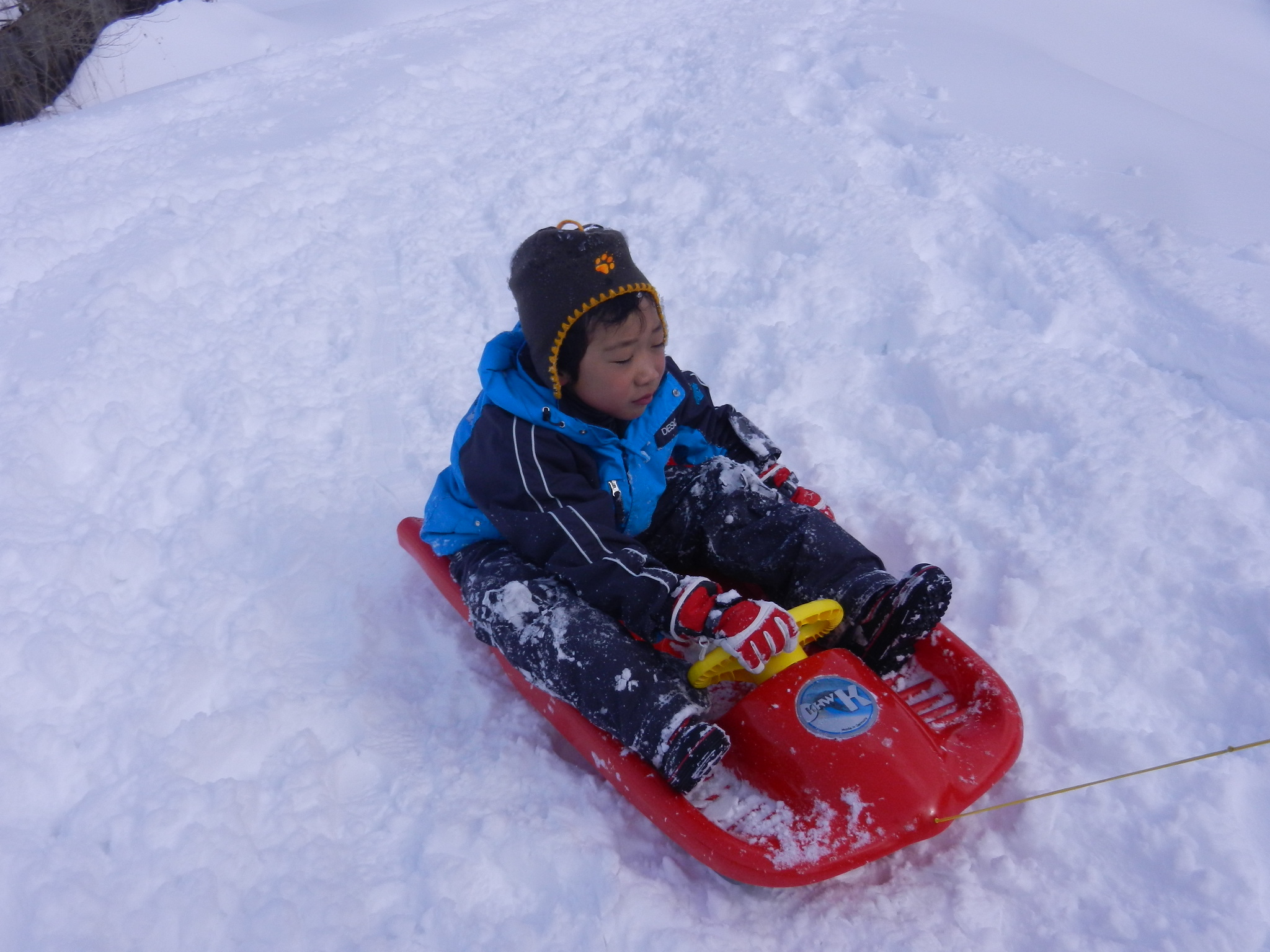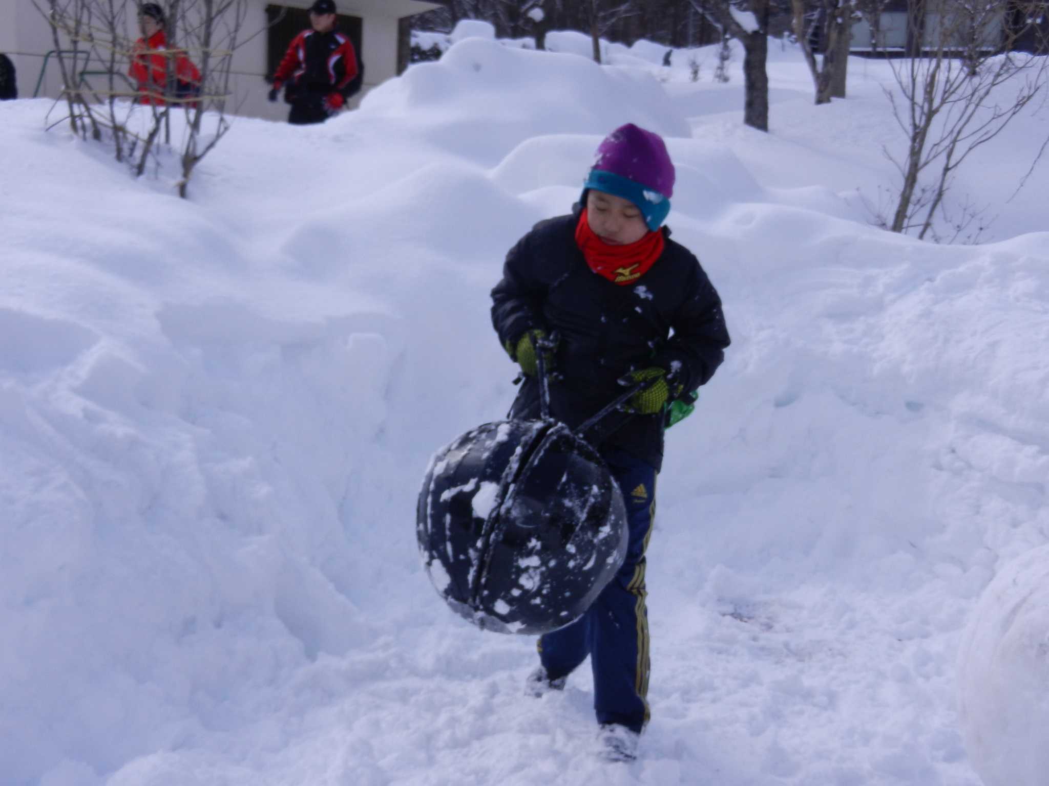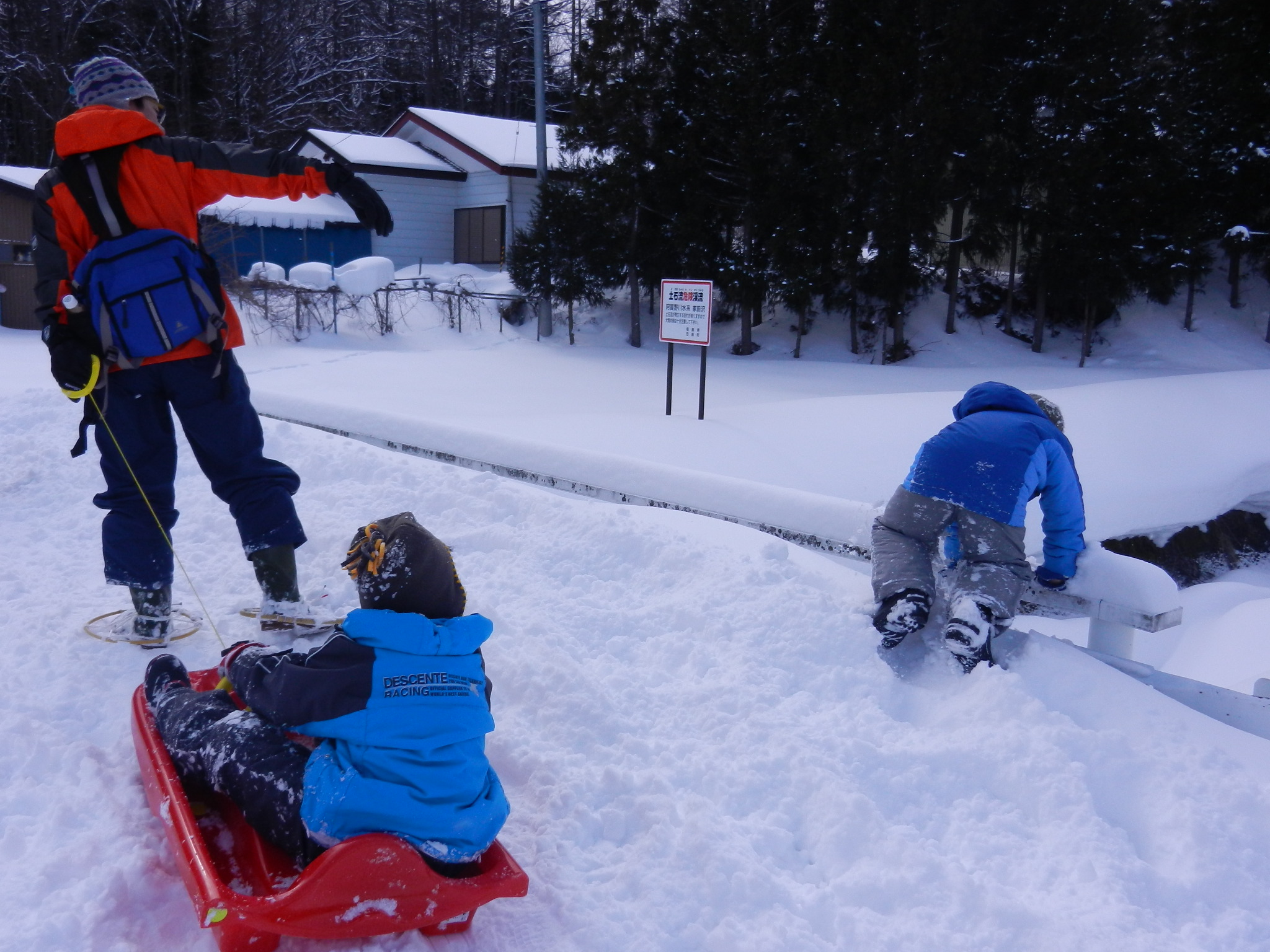 履き慣れないかんじきのせいか、歩き疲れてソリで引っ張ってもらう子供たちもちらほら…