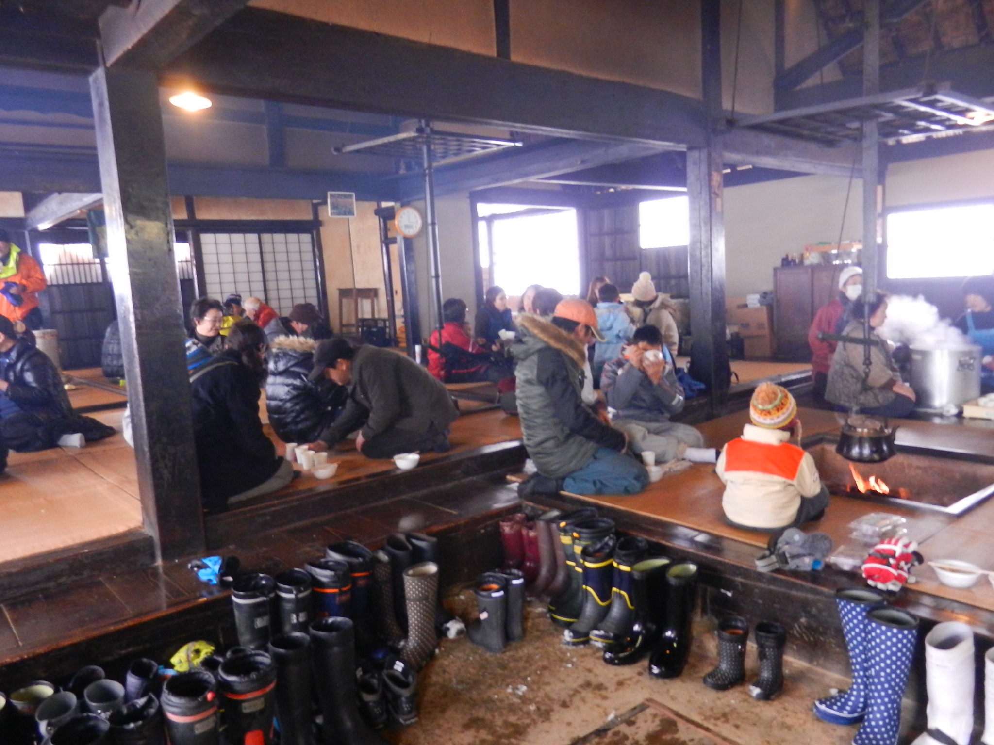 ここで用意されていたお昼を食べます。室内の囲炉裏には火が焚かれていてあったかい(*´▽`)ノ