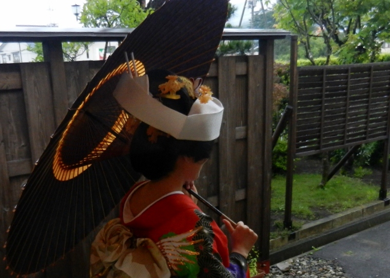 美容室の番傘をお借りして風情を味わいながら記念撮影。京都を思わせるような風情ある立派な造りです。