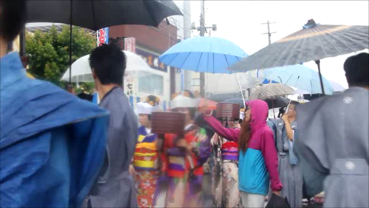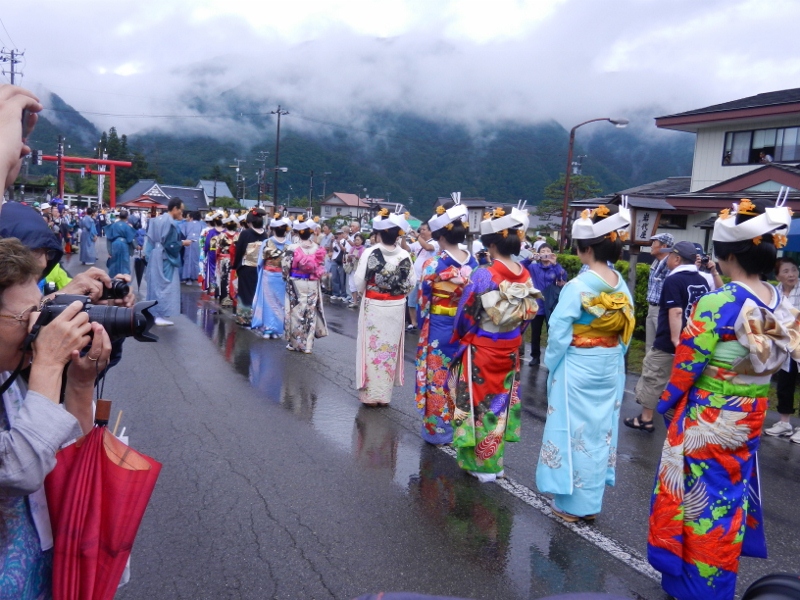 渡御祭に行われる「七行器行列」は、氏子から神前にお供え物を献上する神聖な行列で、袴姿の男性と三十人前後の花嫁姿の女性が列をなして歩く姿は豪華絢爛です。日本一の花嫁行列とよばれ、その優雅な姿を納めようとするカメラマンの数が多いことでも有名な「七行器行列」に参加させて頂きました!