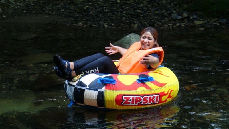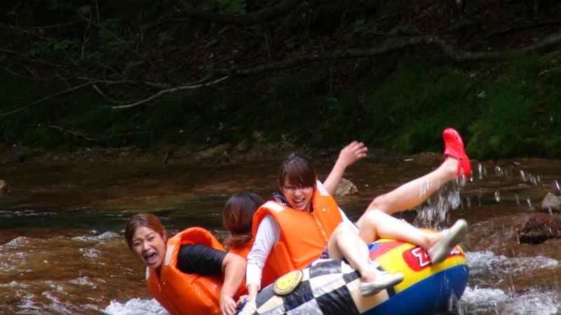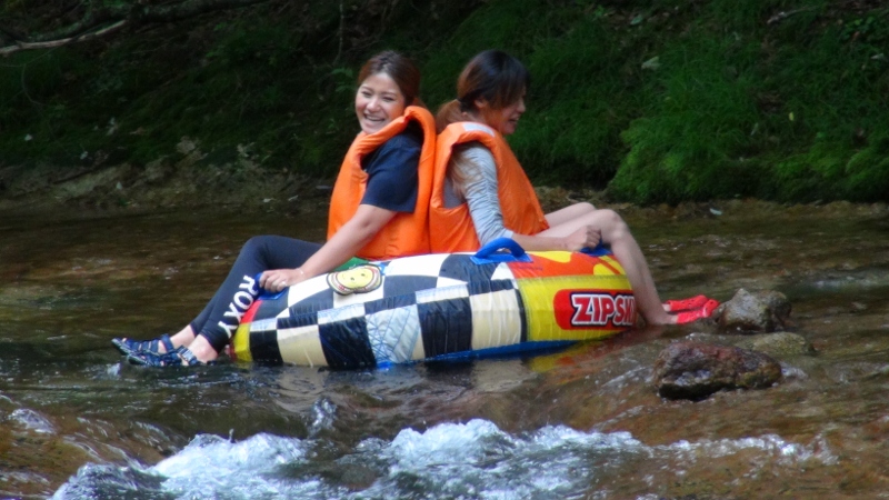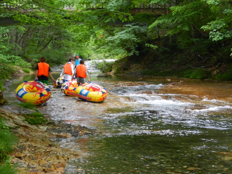 冷たい水も、しばらく川の中を歩いていると慣れてきます。足は、若干赤味を帯びていましたが (^ ^;) そして、いよいよタイヤチューブに乗ってみます! 本当に穏やかな流れの場所なので、インストラクターの方が”いってらっしゃ~い”と力いっぱい背中を押すと、ゆっくりゆらゆらと流れに乗って下っていきます。想像よりも、ゆったり”優雅に”流れていきます。 お子さんを遊ばせていた、お母さんの方が夢中になってしまう事もあるとか(笑)