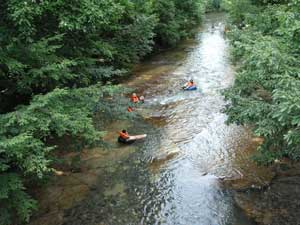 「タイヤチューブ」を持って、渓流の中を上流に向かって歩きながら冷たい水と戯れます。