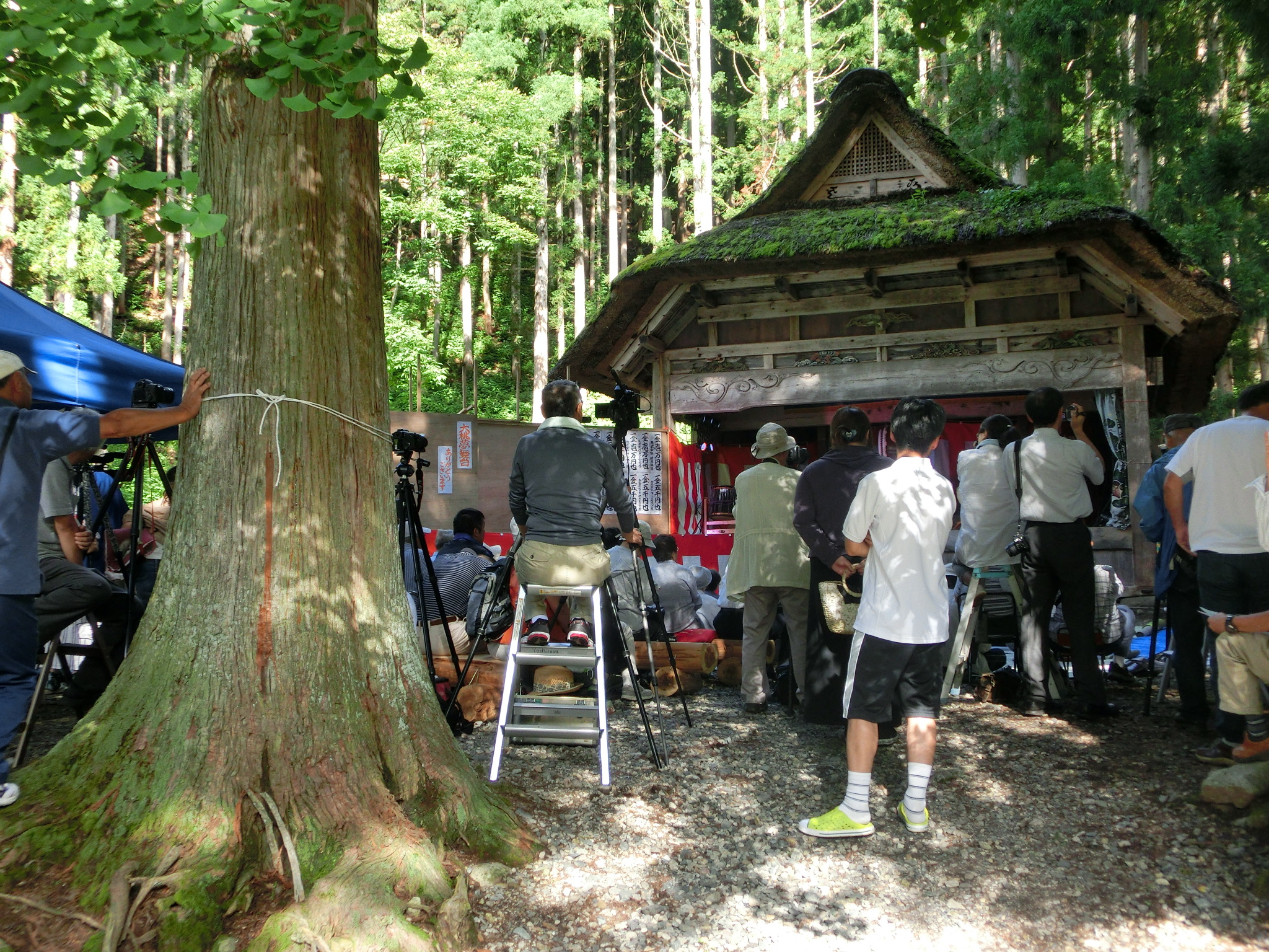 南会津町伊南地区大桃集落、駒嶽神社の境内にある「大桃の夢舞台」は、全国でも珍しい兜造りの茅葺き屋根を持つ舞台です。