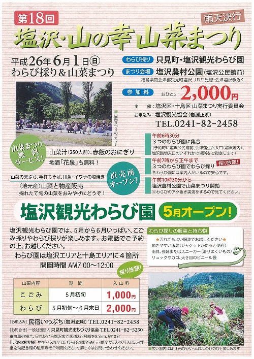 【申込み】 民宿いわぶち(岩淵正明) TEL.0241-82-2458 【問合せ】 只見町観光まちづくり協会 TEL.0241-82-5250 |