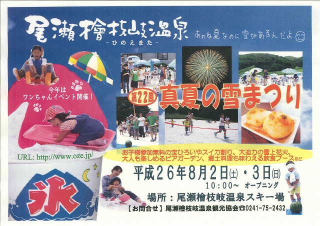真夏なのに、冷たくて真っ白な雪の上でお祭りを楽しめます!お子様無料参加の宝拾いやスイカ割 り、 大迫力の雪上花火大会もあり、大人も楽しめるビアガーデンに郷土料理飲食ブースなど盛りだくさ んの 内容で県内外から訪れる人で 毎年にぎわう注目のイベントです。 今年は、「ワンちゃんイベント」があります!家族みんなで暑い夏を、檜枝岐の冷たい雪で 涼を楽しみましょう。