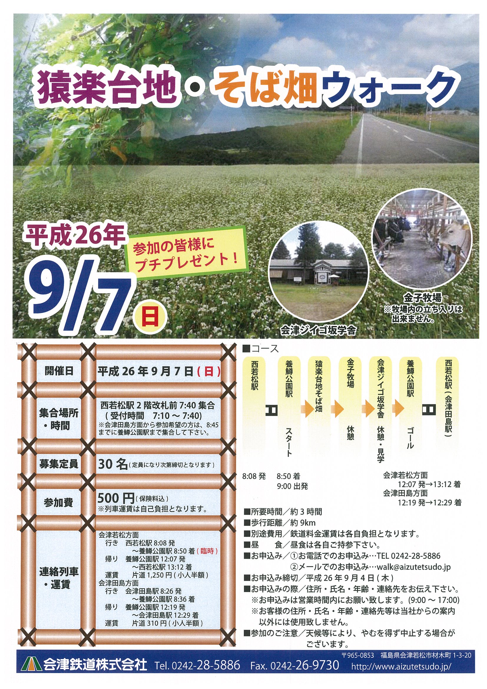 9/7(日)に会津鉄道さん主催で「猿楽台地・そばウォーク」が開催されます。 西若松駅発出発か養鱒公園駅(臨時)集合スタートで、猿楽台地のそば畑を歩き、途中休憩の金子牧場と会津ジイゴ坂学舎を見学して、養鱒公園駅にゴールします。 所要時間は約3時間で距離はおおよそ9kmです。 美しい「そばの花」の風景を愛でながら、南会津の秋を感じてみませんか。 参加者全員にプチプレゼントも貰えますよ♪