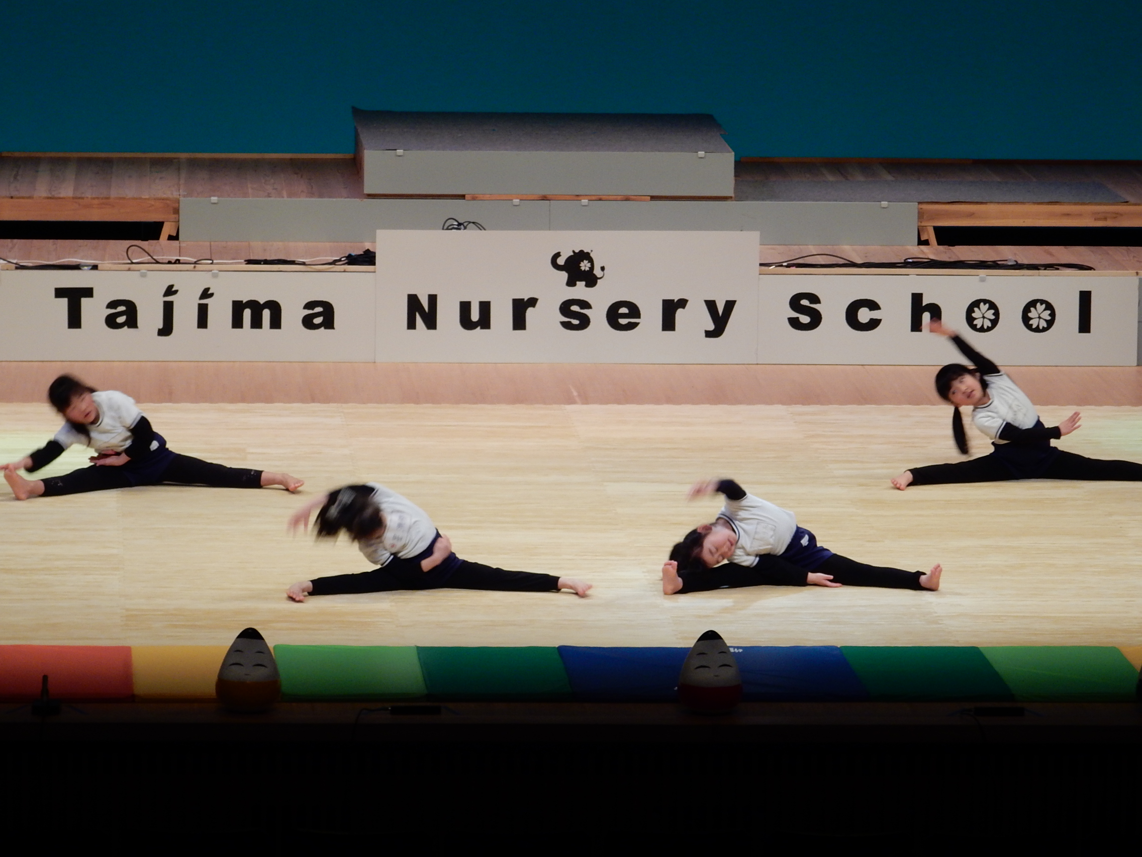 初めは4歳児のマット運動で柔軟体操から、みんな体が柔らかく、