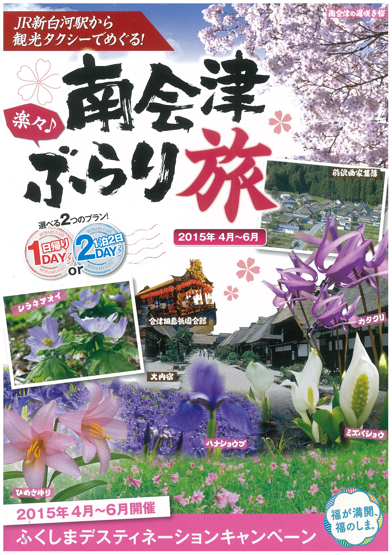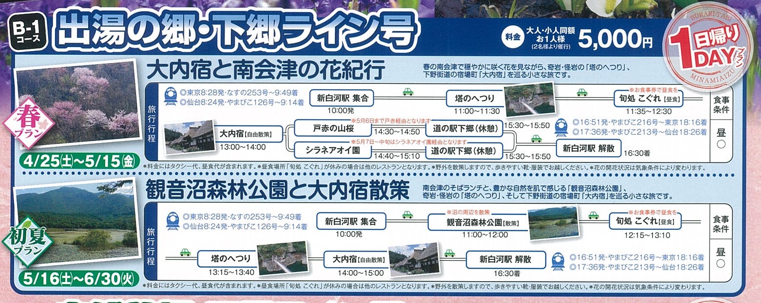 春プランは4/25(土)~5/15(金)までの『大内宿と南会津の花紀行』です。