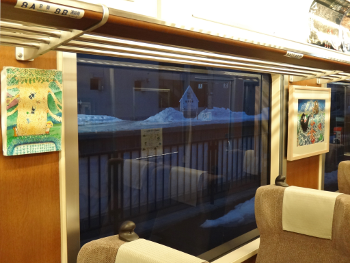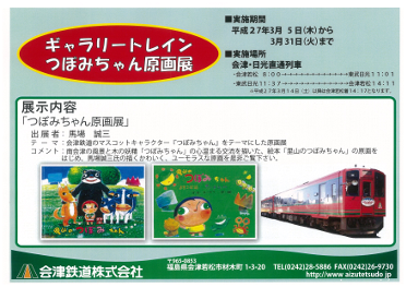 タイトルのゆるキャラをご存知ですか?大々的にはPRしていないので知る人ぞ知るといった感じですが、会津鉄道のマスコットキャラクターなんです。デザインは下郷町在住の馬場誠三さん。アーティスト、イラストレーター、演歌歌手として地元では有名な方です。馬場さんが描いたつぼみちゃんの原画を車内に展示したマウントエクスプレスが、雪景色の南会津をガタンゴトン走っています。期間は(3/5~)3/31(火)までです。これは何の絵だろう?よりも、あぁ~、これがつぼみちゃんか!のほうが南会津の列車旅が楽しくなるはず。早速ご紹介していきます。