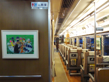 車内につぼみちゃんと仲間たちの楽しそうな様子が描かれた原画が展示されています。
