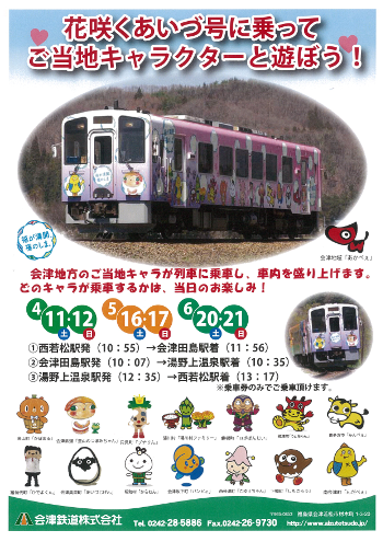 そして、間もなく始まるキャンペーンに合わせて開催れるのが「花咲くあいづ号に乗ってご当地キャラを遊ぼう!」です。4/11(土)・12(日)、5/16(土)・17(日)、6/20(土)・21(日)の6日間、花咲くあいづ号にゆるキャラが乗車して車内を盛り上げてくれます。南会津をのんびり列車に揺られながら、ゆるキャラたちと楽しく遊んでください。ちなみに、どのゆるキャラが乗車するかは当日のお楽しみです!