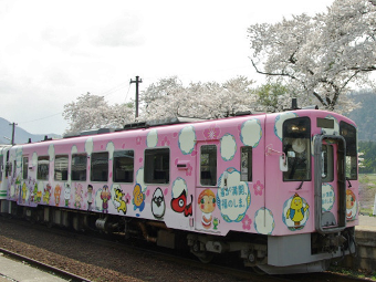 この会津鉄道に昨年(2014年4月)デビューしたのが、写真の「花咲くあいづ号」です。車体に描かれているのは会津地方の14のゆるキャラたち。4月・5月・6月に開催される「ふくしまデスティネーションキャンペーン」のテーマの1つ、”花”に合わせてデザインされた車両です。キャンペーンのロゴマークと花、そしてゆるキャラたちが楽しげに遊んでいます。