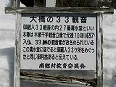 ■御詠歌「極楽の 道は迷はず渡り行く 法(のり)の誓ひにあうは大橋」 ■大橋清水堂、南会津町大橋 ■第二十六番 2.9km 第二十七番 1.3km 第二十八番 ■27番札所の大橋清水堂に詣でると33ケ所を巡ったと同じ御利益があると言われています。 ●動画<新南会津紀行>よぐきゃった「御蔵入三十三観音札所」巡り をどうぞ。