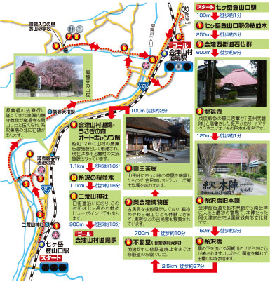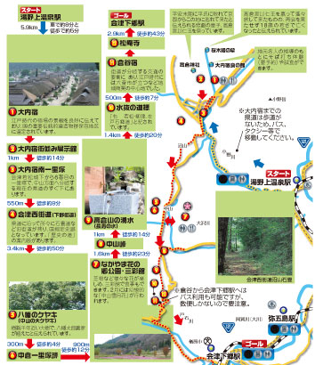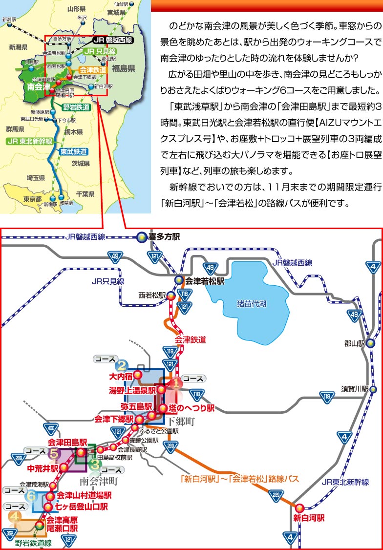 ※湯野上温泉駅から大内宿までは歩道がないため、バス・タクシー等での移動をおすすめします。9 月~ 11 月の土・日・祝の利用なら、湯野上温泉・大内宿を経由する路線バスがおすすめ。芦ノ牧温泉や会津若松駅まで行けるので、泊りがけの観光にも便利です。