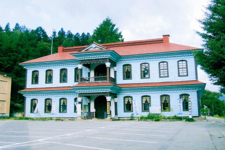 明治初期の洋風木造建築。ギリシャ建築を思わせる円柱や、扇形のステンドグラスなど建築された明治時代の当時としては県内最大規模の郡役所でした。
