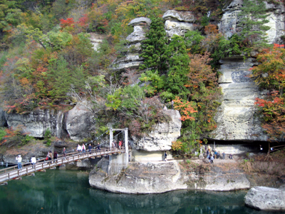 長い年月をかけて自然が作り出したこの渓谷は、塔の形が立ち並ぶ断崖という意味から「塔のへつり」と名づけられました。へつりとは地元の言葉で断崖のことです。塔の形をした断崖まで吊り橋が架けられ、断崖内部の一部を見学することもでき、その特異な形から、1943年に国の天然記念物に指定されています。