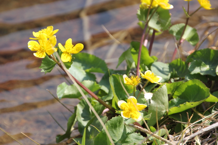 早春、黄金色の花を湿原の川沿いに咲かせます。金色の花が直立に咲くことでこの名がつけられました。