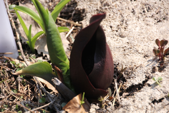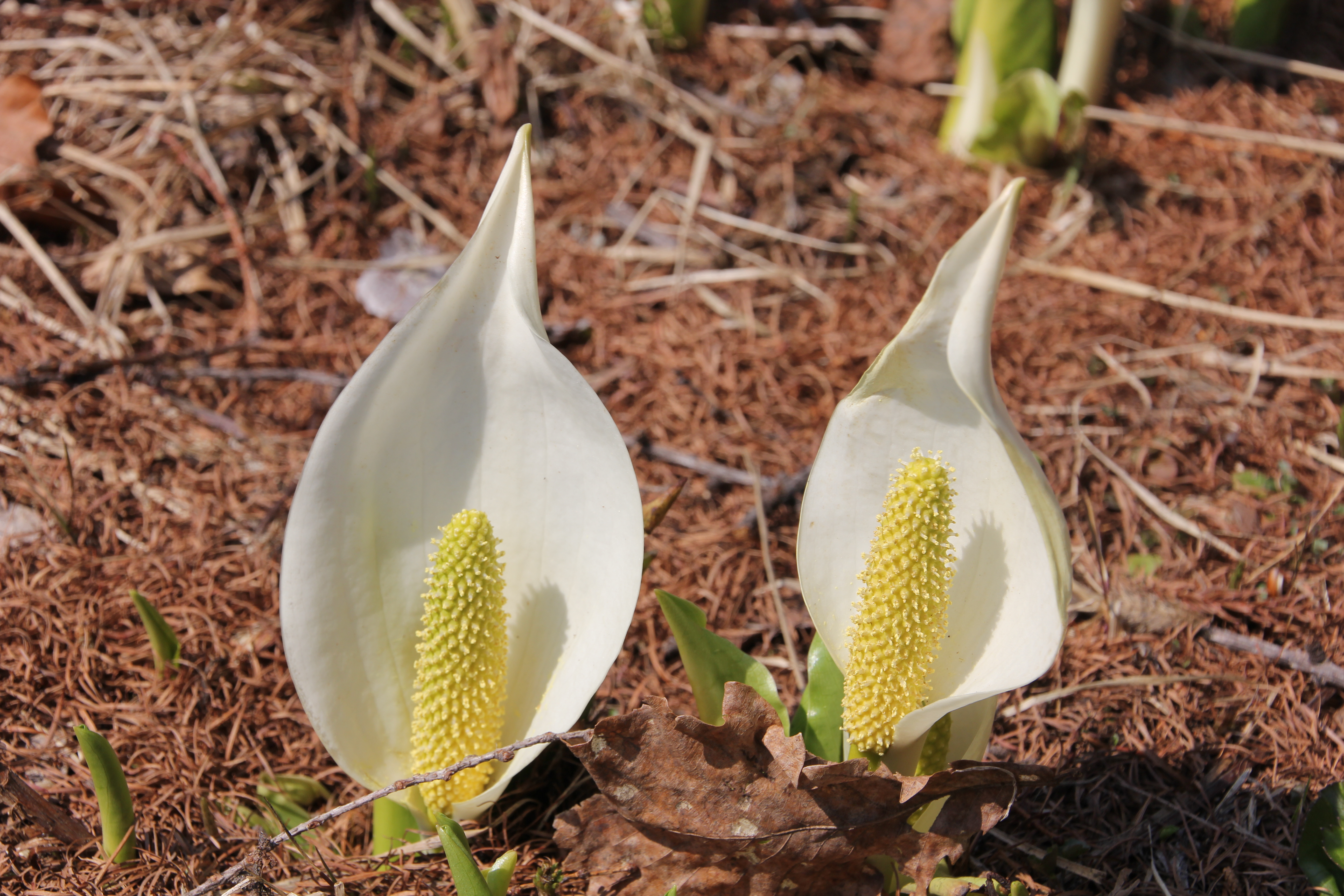 湿地に自生し発芽直後の葉間中央から純白の仏炎苞(ぶつえんほう)と呼ばれる苞を開く。