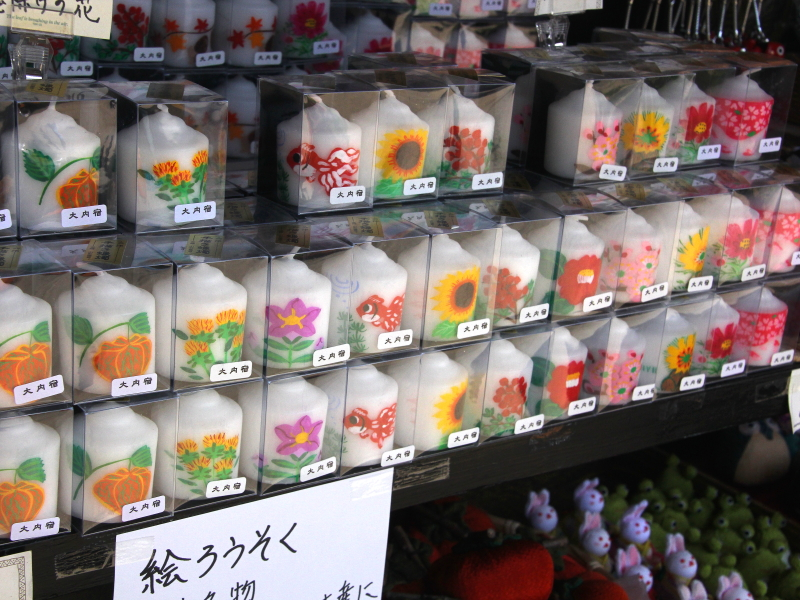 会津の名産品を取り揃えた店。 定番の絵ろうそくや起き上がり小法師、会津もめんで作った色とりどりの手作りぬいぐるみが店頭を飾ります。土産物のほか、 もんぺ(女性の労働用ズボン)や割烹着の販売は大内宿の雰囲気作りに一役かっています。店舗脇には休憩所が設けられており、お茶を頂きながら一休みするこ とができます。