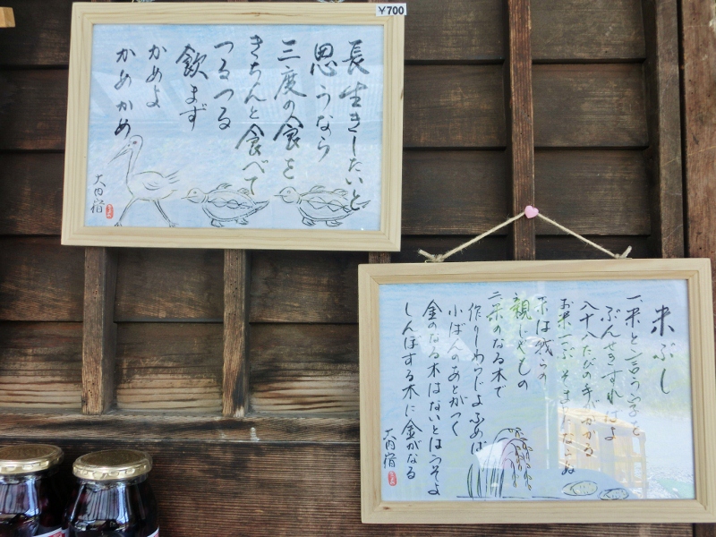 おかみさんの手書きエッセイは、もともとは趣味で始めたものがお客様に評判で、書き続けているうちにお店のメインになってしまったとか。店の軒先には毎年春になるとツバメが巣を作るそうで、「毎年ちゃんと帰ってきてくれるし、もう家族みたいなもんだね」とご主人。店の前には休憩スペースがありますので、おかみさんの作品を見ながら、春にはツバメの親子を眺めながら、のんびりとお休みください。