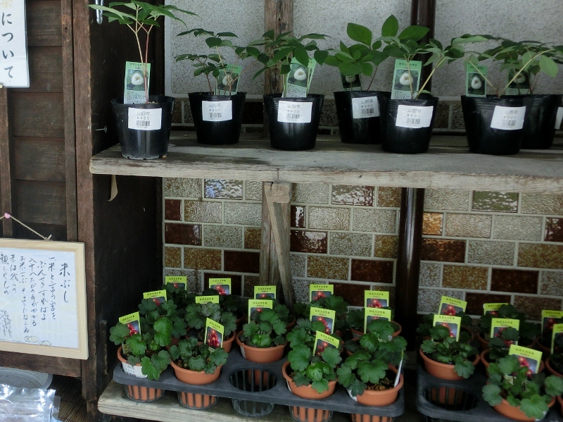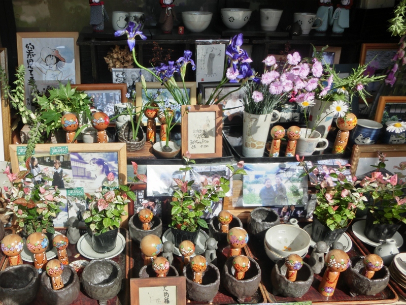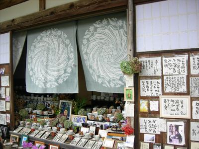 「山野草 松美屋」と掲げた看板の通り、店頭には一輪挿しや花器が店頭に並び、季節の花々が飾られています。そして訪れる人々の目をひくのが、おかみさんの手書きのエッセイ(絵葉書風)です。心温まることばやイラストなど、たくさんの作品が店を華やかに飾っています。