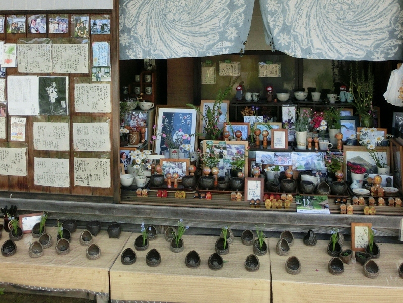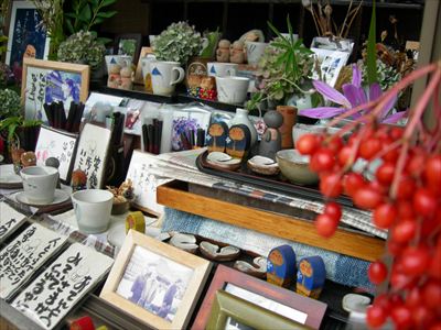 山野草や山々の草花を飾って楽しめる器など会津の焼き物が楽しめます。お買い上げ下さったお客様には、一筆書いた手描きの絵ハガキをプレゼント。