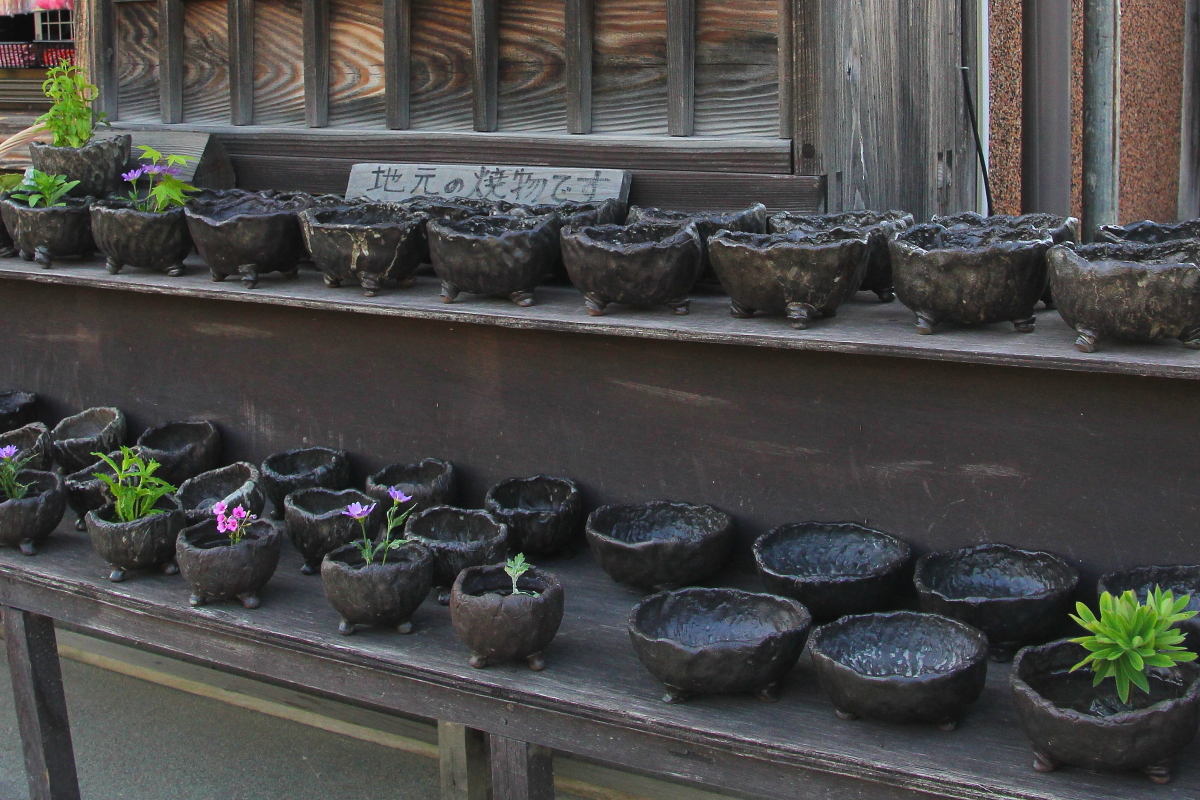 大内宿駐車場から左側4軒目です。地元の焼き物で「陶芸工房はる」さんの水盤に花が飾ってあります。とってもかわいいですヨ!ぜひ見に来てください・・旅の記念にいかがですか。