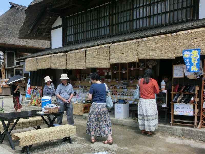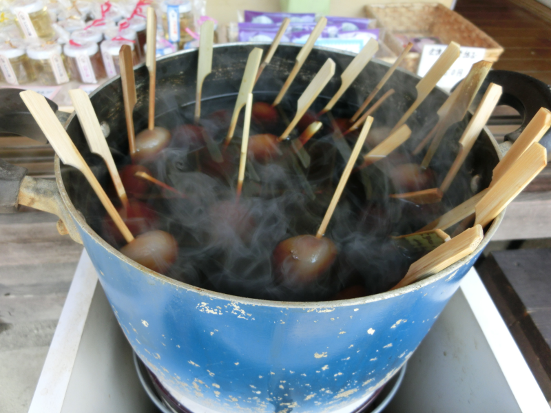 大内宿街並み展示館の向いにあるお土産・軽食の店です。「揚げ餅・たまこんの店」と看板に出している通り、おすすめは店頭の大きな鍋で煮ている「玉こん」。なんとくじつきで、串の先が赤かったら当たり!もう1本サービスしてくれます。お土産や雑貨などをのぞきながら素朴な味をお楽しみください。