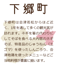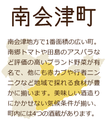 南会津には4つの酒蔵がありきれいな水と酒造りに適した気候風土で4蔵4様の酒づくりをしています。※各酒蔵にてお酒の購入は可能ですが、酒蔵内の一般開放はしていません。見学は事前問合せが必要です。 |