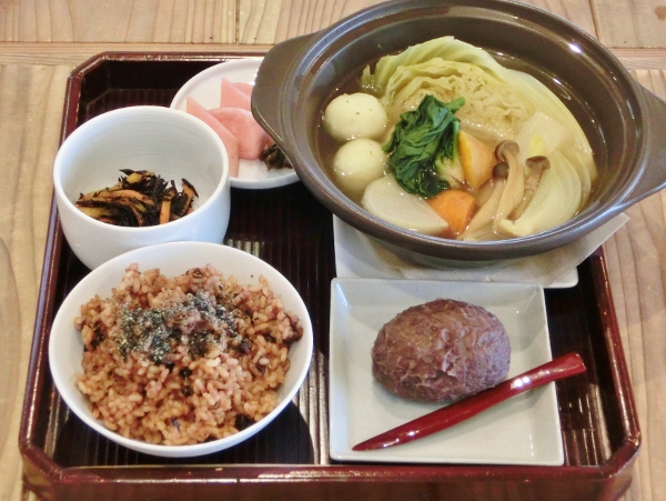 郷土料理レストラン。黒古代米やバイキング料理と一緒に郷土料理を味わえます。「ぎおん」はつゆじとにしんの山椒漬。「みなみやま」は本棒鱈煮もついた3品。