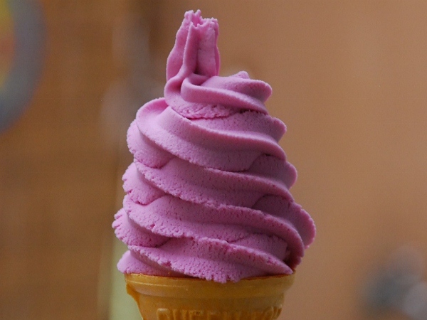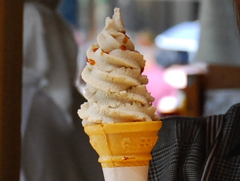 焼きたてのべったら餅は萬屋名物。初恋の味がするという山ぶどうソフトクリーム(250円)はもちろん手作りです。