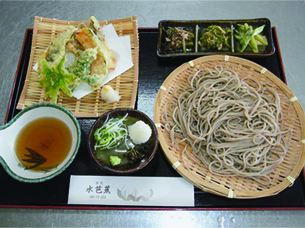 四季折々の旬の野菜の天ぷらや山菜がそばの味を引き立てます。岩魚味噌も購入可。 |