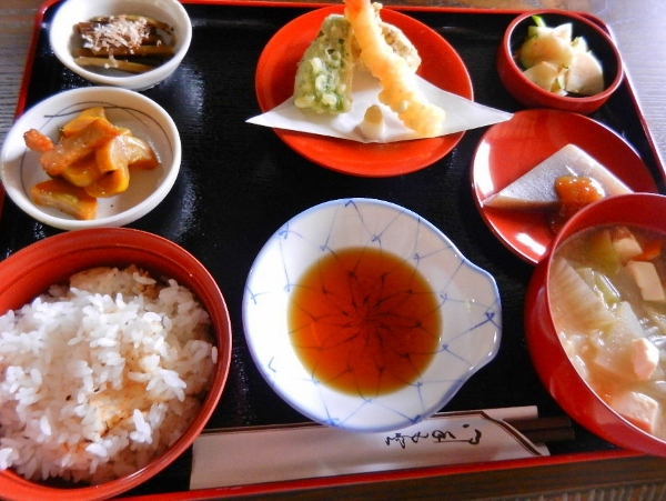 隠れた癒しの空間。マイナスイオンを浴びながら、山菜メニューの食事を楽しめます。