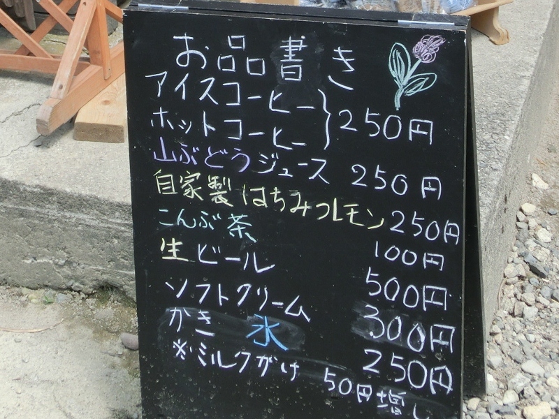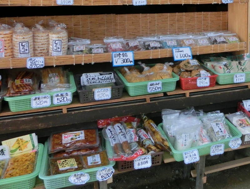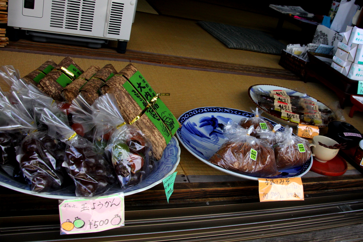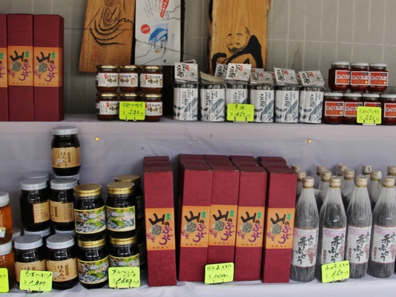 とち餅 650円 栃実大福 650円~ 起き上がり小法師 300円 お菓子 260円~ 山ぶどうジュース 650円 絵ローソク 450円 そば 550円~ 加工食品 540円~ 水ばん 700円~