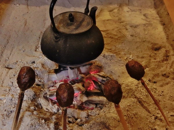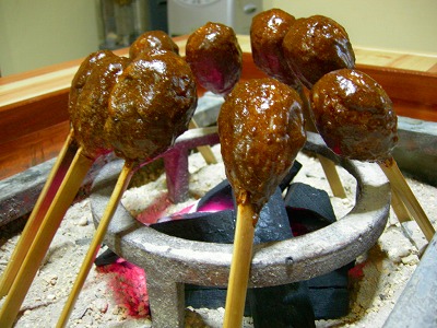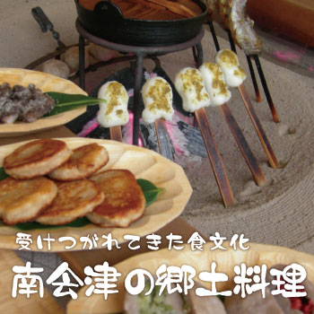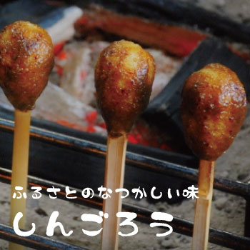 その昔、新五郎という人が貧しくてお餅を神棚にお供えできず、普通のごはん(うるち米)をつぶして供えたところそれが美味しくて村じゅうの評判になったことが始まりだとか。(諸説あります) ほんのり甘いじゅうねん味噌の香ばしさ、半つきにしたごはんのモチモチとした食感は誰もが懐かしさを感じる味。炭火で炙ることで風味が増し、さらに食欲をそそります。 囲炉裏のあった頃は各家庭ごとに作るのが習慣で、それぞれの家で違う美味しさがありました。家庭から囲炉裏が消えたこともあり、今では家庭で作ることはほとんどありませんが、イベントなどでは必ずしんごろうの露店が出され、地元の人々が好んで買い求めます。南会津の人々に親しまれてきた田舎の家庭の味をぜひ食べてみてください。 |