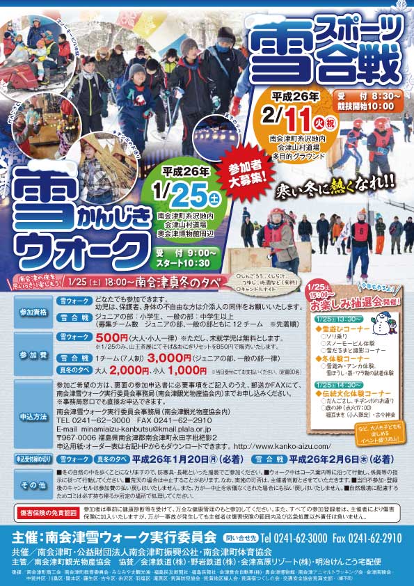 雪かんじきウォーク(スポーツ雪合戦も参加募集中) ■日時 2014年1月25日(土) ■場所 南会津町 会津山村道場 ■参加資格 どなたでも参加可能 ※要事前申込 詳しくは左のチラシをご覧ください。 |