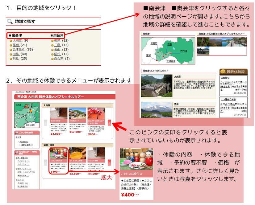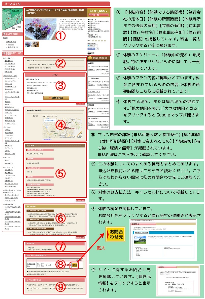 グルメ、自然・景観、温泉、歴史・文化、ものづくり、アクティビティなどの幅広いジャンルの観光体験を網羅しています。