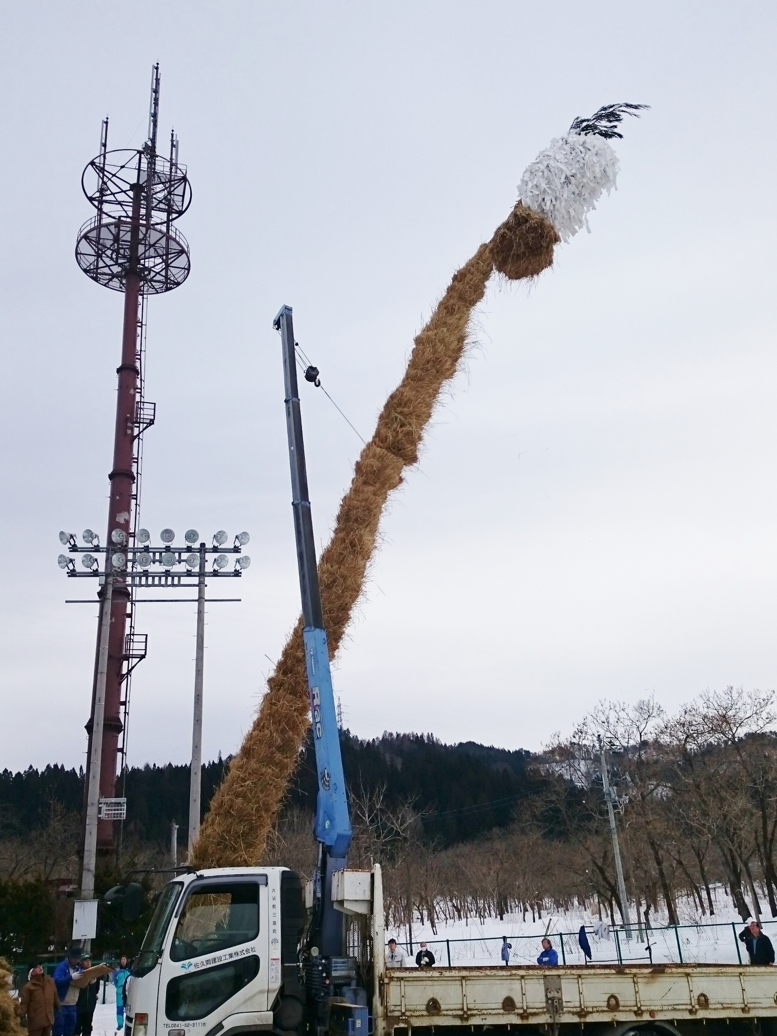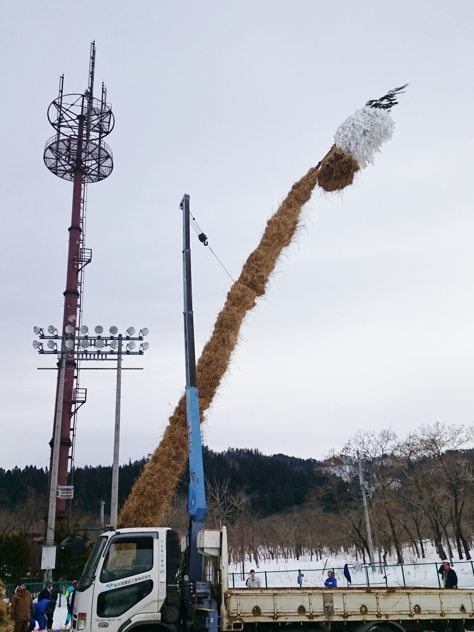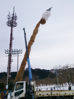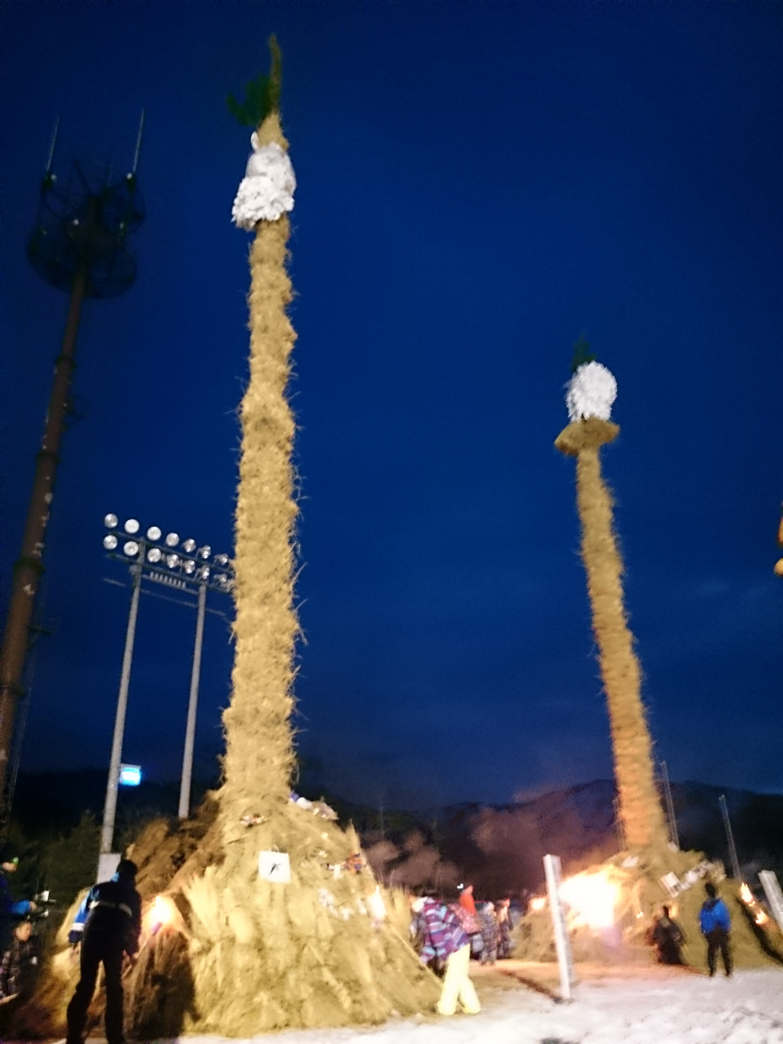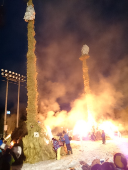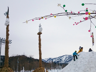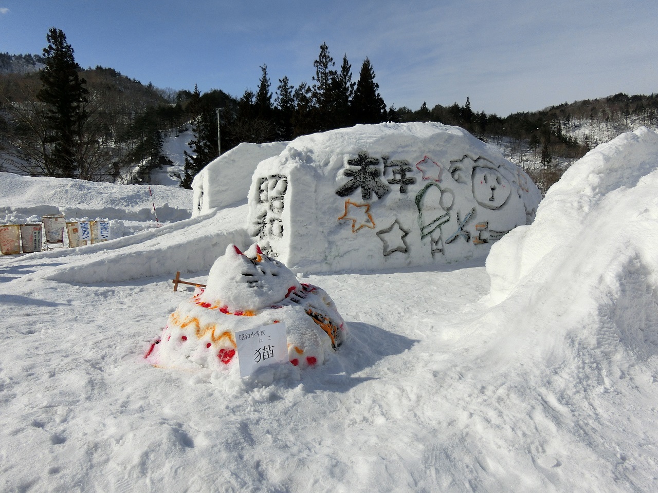 芝生広場には雪像や後ほど歳の神が行われます。雪像は映画「ジヌよさらば~かむろば村へ~」の守り神おがむろ様や柳津中・西山中学校による「雪灯篭」などの雪像が並んでいました。