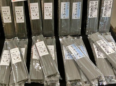 桐炭を混ぜ込んだ商品が並びます。つるっとしたのど越し&もちもちとした食感が特徴の麺はいかがですか? |