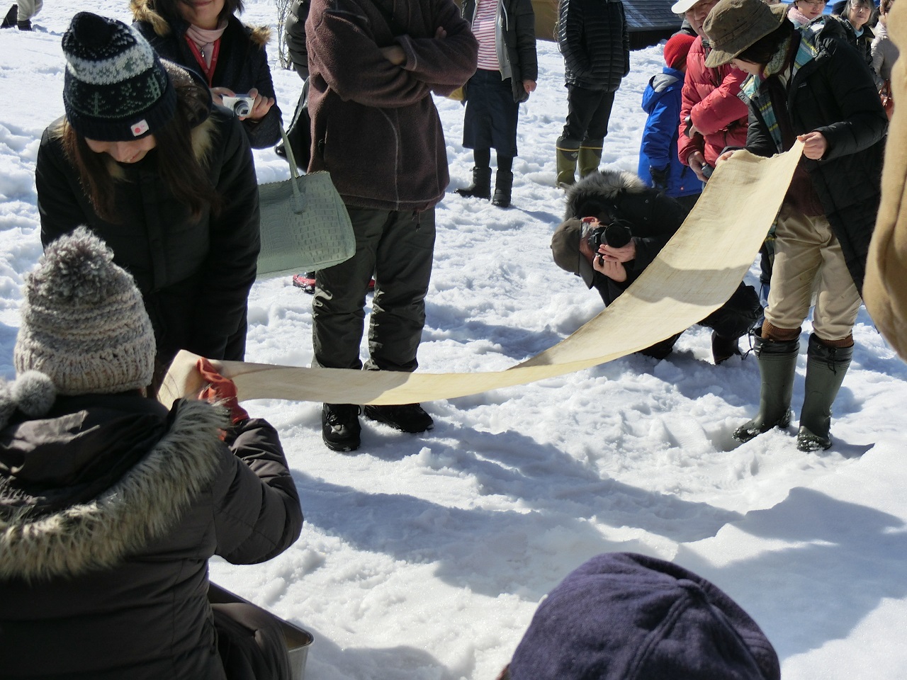 雪にさらすことによって、不純物が取り除かれ、布は白くしなやかになります。紫外線と水蒸気の化学反応で発生するオゾンの作用だと言われていますが、先人たちは、このことを昔から自然と知っていたのですね。