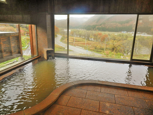 | むら湯は、源泉かけ流しの褐色のお湯が特徴。窓からの眺めも良く、秋には紅葉を見ることができます。 |