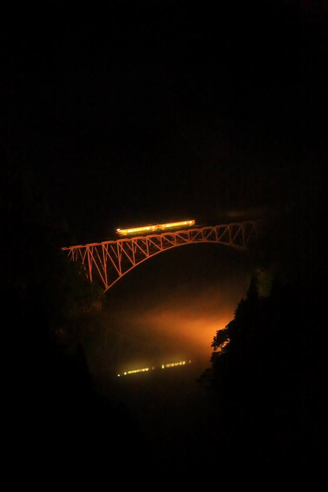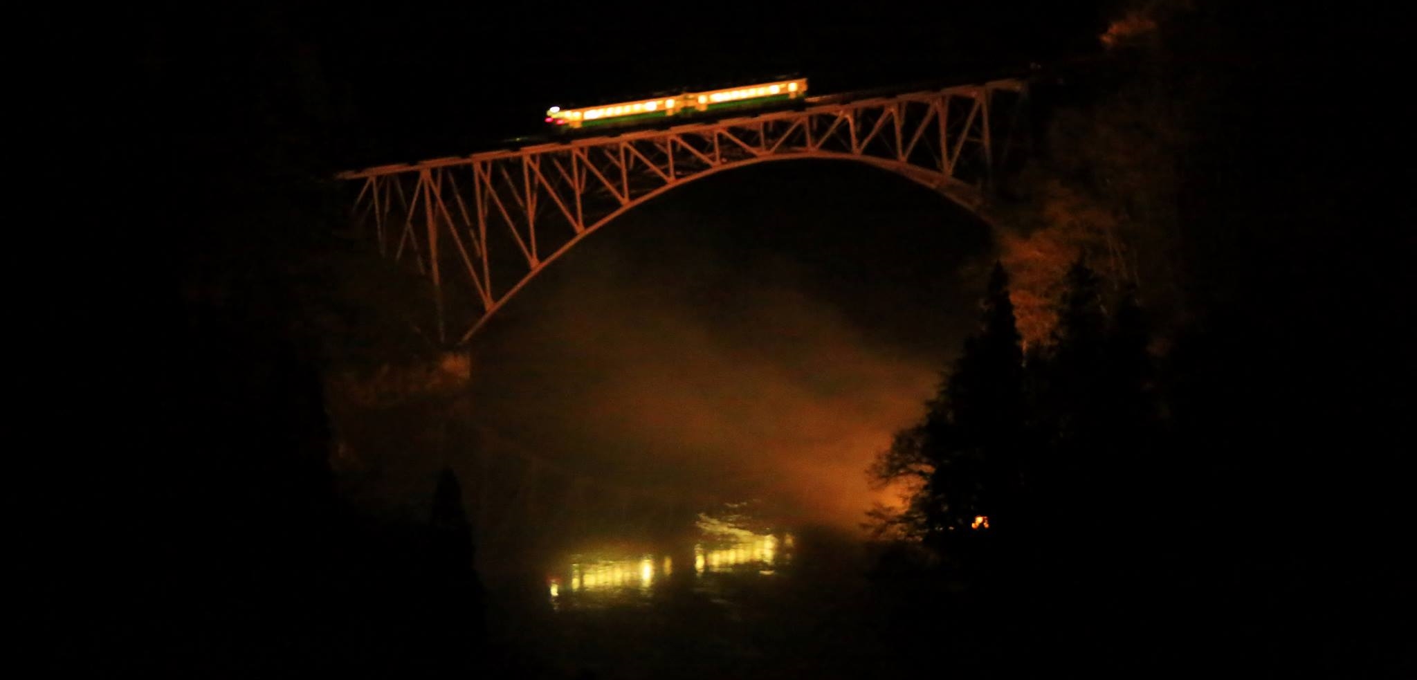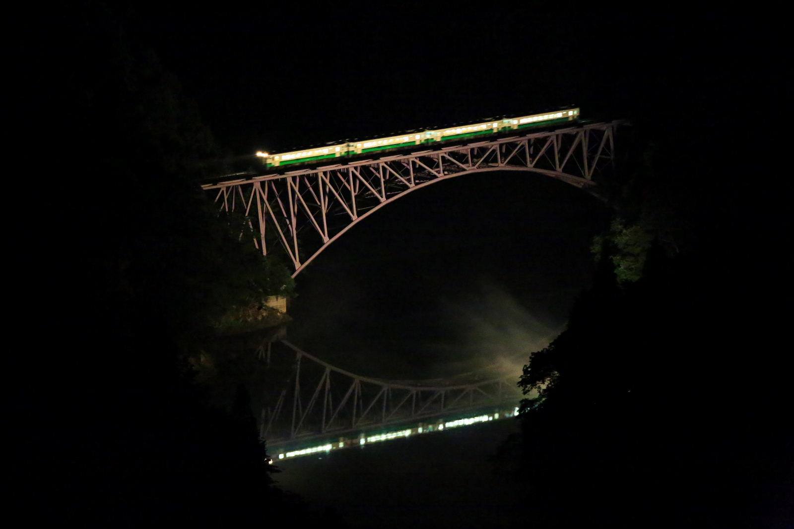 | 暗闇の中に浮かび上がった第一只見川橋梁 | 会津若松行きの上り列車 434D |
