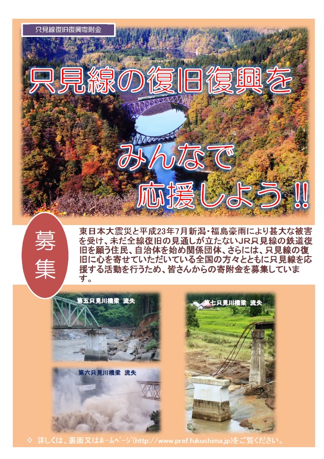 只見線を応援する活動を行うため、寄附金の募集をしています。 この寄附金は、福島県・会津17市町村や新潟県などで組織する「福島県JR只見線復興推進会議」で協議の上 只見線の復旧や利活用促進のために使用されます。
