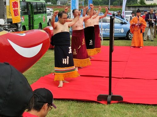 開会式前には、野老沢(ところざわ)郷土芸能保存会の方々による野老沢相撲甚句の披露があり(写真左)、たくさんの人が見物。 そこへ、柳津町のゆるキャラ・うとちゃん&うとこちゃんが登場゚+.(・∀・).+゚.ちびっこに大人気! 入念に準備体操をして身体をほぐし、スタート準備!! |